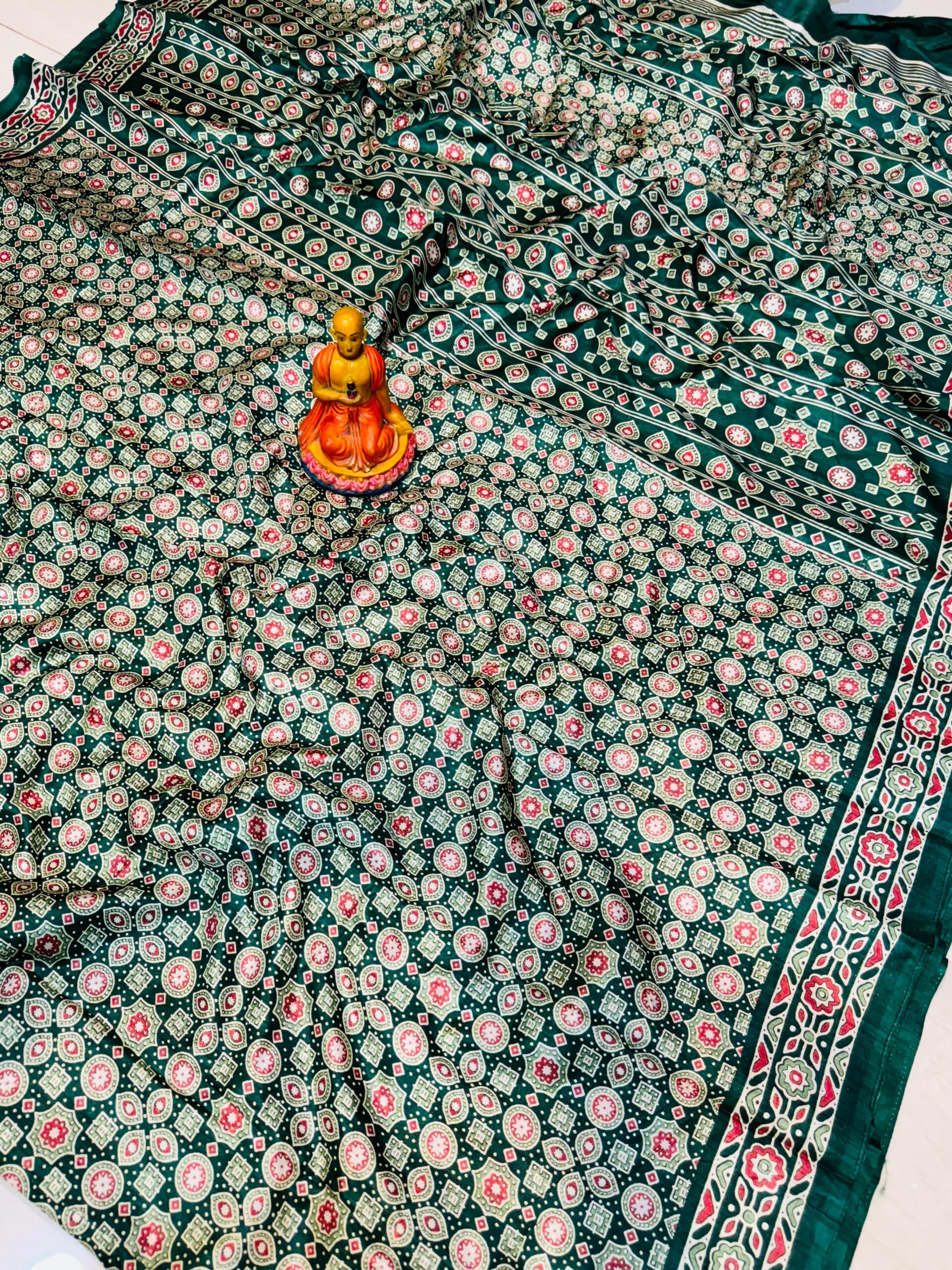 Premium Ajrak print silk saree with traditional motifs and rich texture.